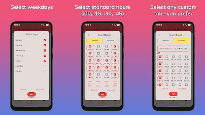 🕰️ Set Any Time: Chime on the hour, at specific minutes (e.g., :15, :30, :45), custom intervals (5/10/20 min), or even precise times like 12:58. Also select any weekdays you prefer for each chime.