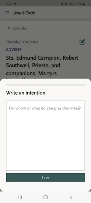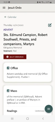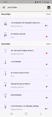 The Jesuit Ordo contains the Order of Celebration for the Eucharist and the Liturgy of the Hours for Jesuits in the United States. The Jesuit Ordo reflects the updated calendar of Jesuit saints and blessed issued by the Roman Curia of the Society of Jesus. It follows the liturgical calendar, containing the readings of the day, starting from advent to the end of the following advent.