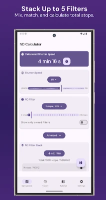 Set your base shutter speed, choose up to 5 stacked filters (0–24 stops, fractional included), and get your adjusted speed—instantly.